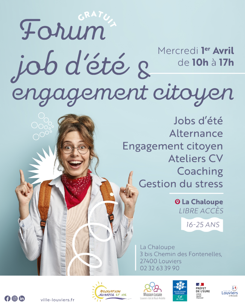 La Ville de Louviers organise le Forum Jobs d’Été & Engagement Citoyen. Cet événement s’adresse aux jeunes de 16 à 25 ans souhaitant trouver un job d’été, découvrir des opportunités d’engagement ou bénéficier de conseils pour préparer leur entrée dans le monde professionnel.